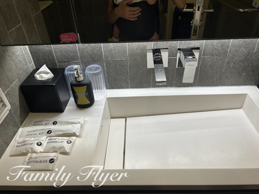 フラットなシンクにはハンドソープが設置されているほか、コップがグラスではないのでお子様連れも安心。