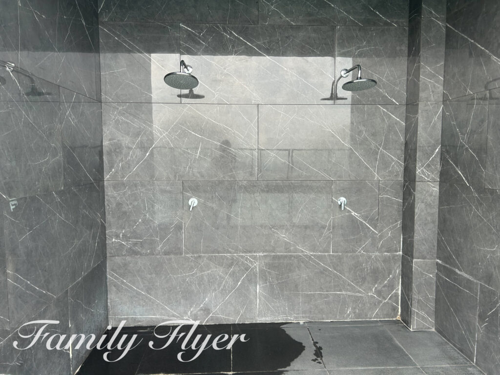プールの正面にシャワーあり。間隔が近いので他人同士では使いにくそうです