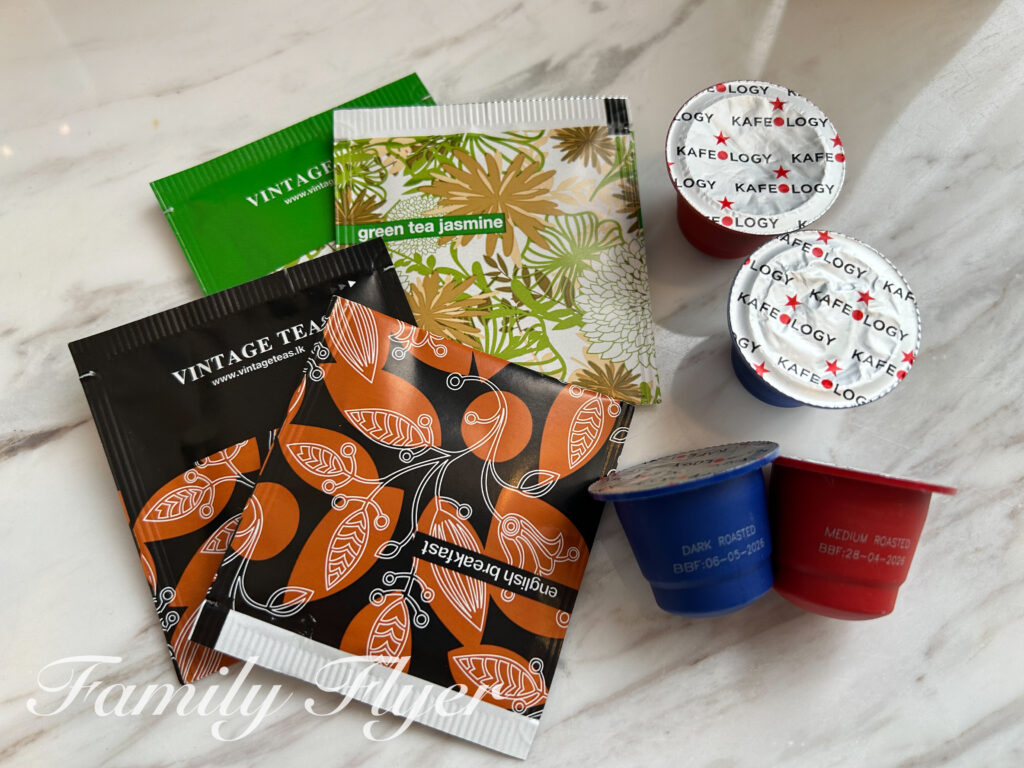 ネスプレッソでロビーカフェのコーヒーも楽しめるのも嬉しい!紅茶類はスリランカ発Vintage teasの香り高いイングリッシュブレックファストとジャスミンティー。