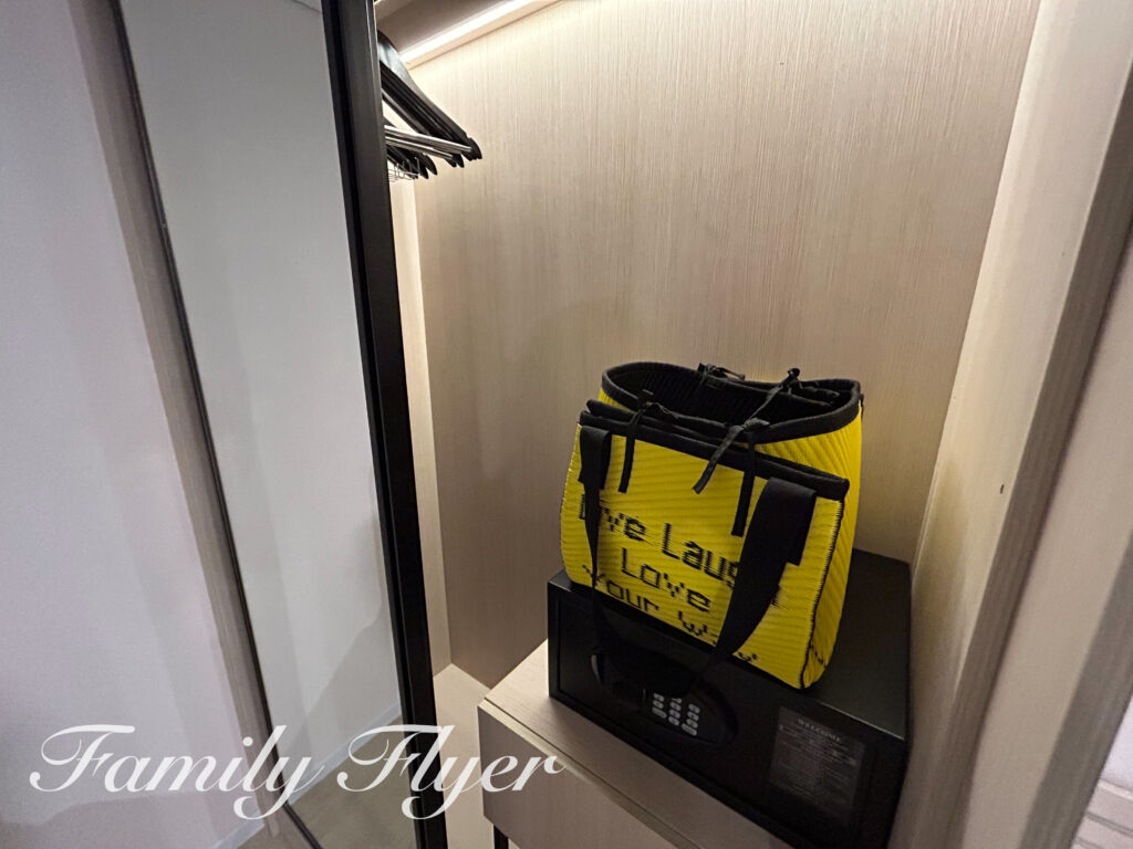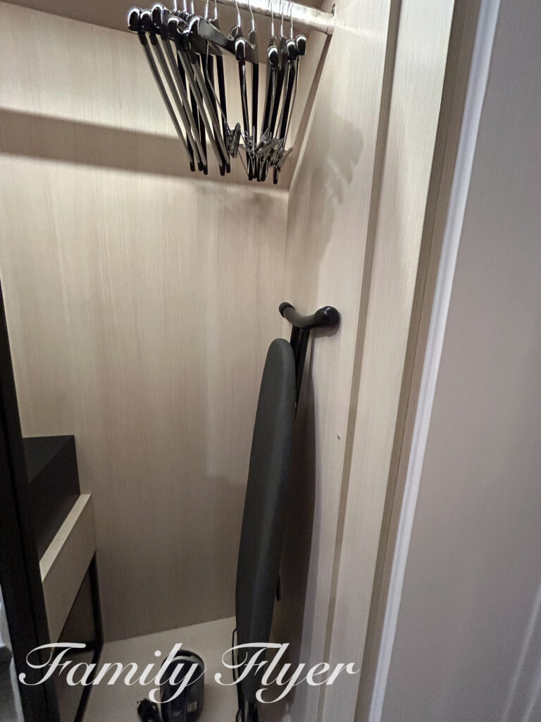扉が全身鏡のクローゼットやバゲージラック。スペースはコンパクトですが無駄なくすっきりしているので狭さは感じません。