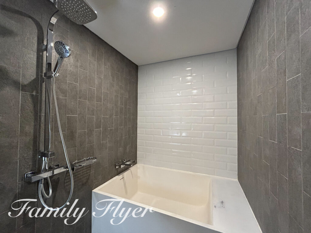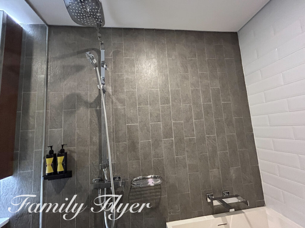 バスルームは1階部分のみですが、大きなバスタブやレインシャワーも完備。水圧はやさしめなものの、ハンドシャワーのホルダーが調節できたり小物を置くスペースがあったりと使いやすく無駄のない設計です。