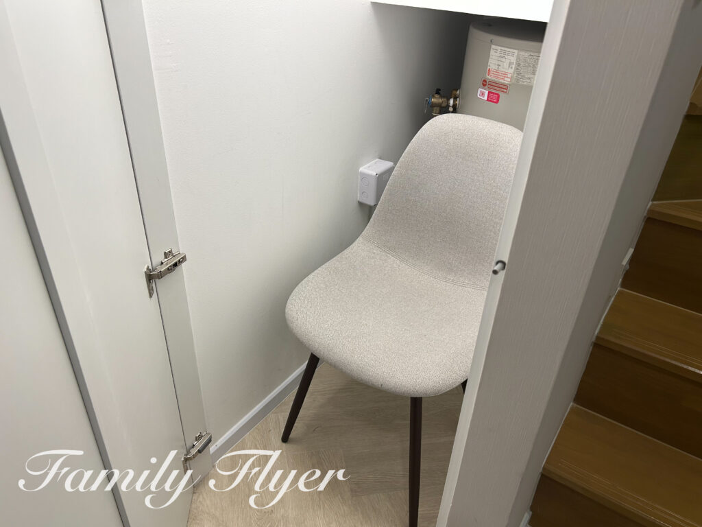 階段下の扉には予備の椅子が設置されています。お子さんには開けづらいとは思いますが、万一入って閉じ込められないよう少し注意が必要です。