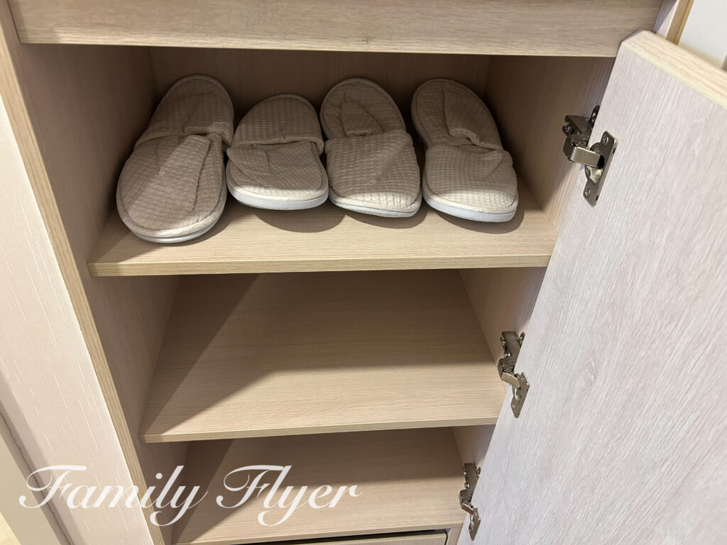 家族連れでも充分な靴収納。ここにスリッパがありますが、使用感がすごかったのでそっとしておきました。