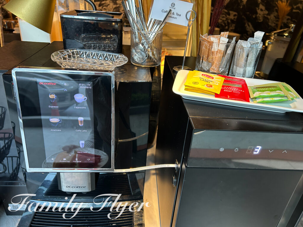 コーヒーマシンはDr.Coffee、紅茶類はトワイニングのイングリッシュブレックファストとジャスミンティー、リプトンのイエローラベル。