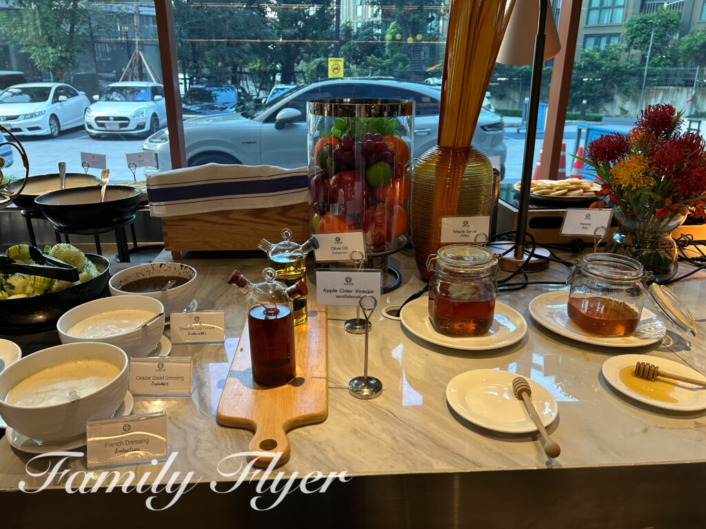 シンプルなサラダバー。オリーブオイルやアップルビネガー、ドレッシングはフレンチ・シーザーに加え、日本人宿泊者が多いからか胡麻醤油も。