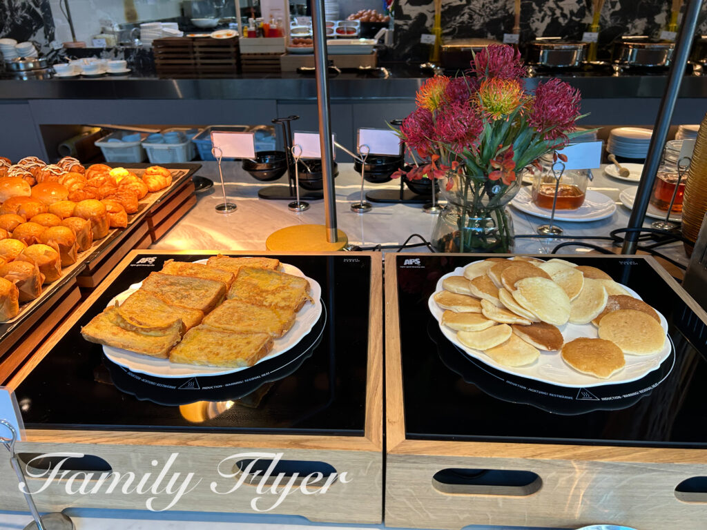 パンケーキとフレンチトースト。はちみつとメープルシロップは向かい側にあります。