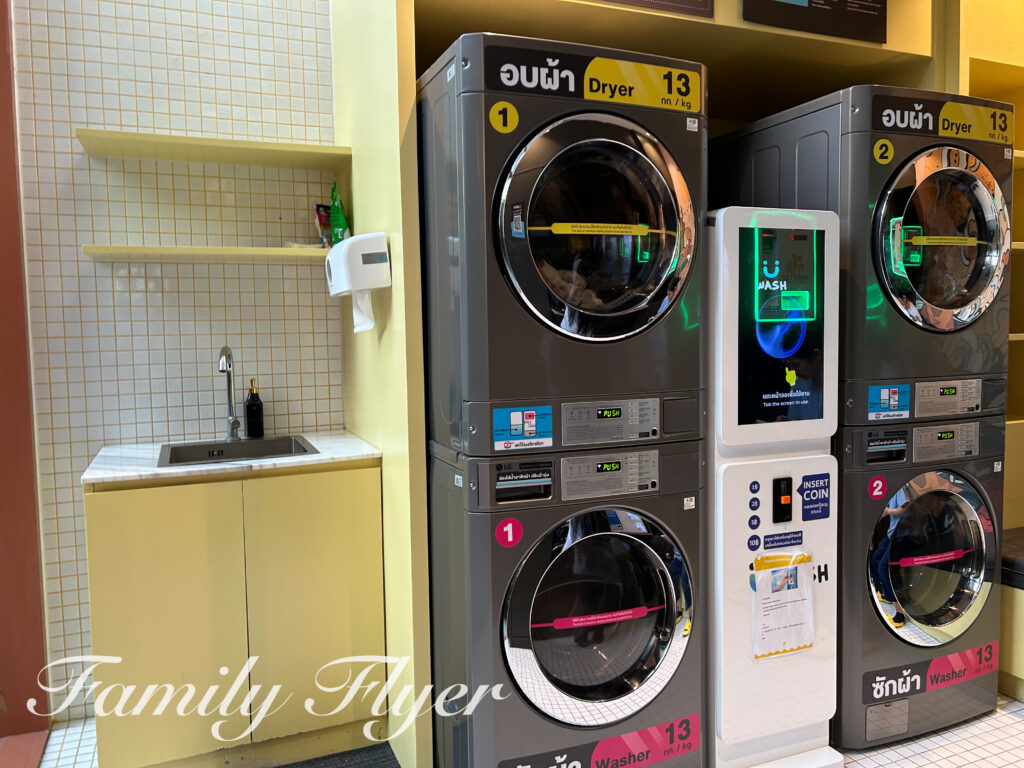 24時間営業のコインランドリーは長期滞在や家族連れの強い味方。ロビー奥、カフェの向かい側にあります。