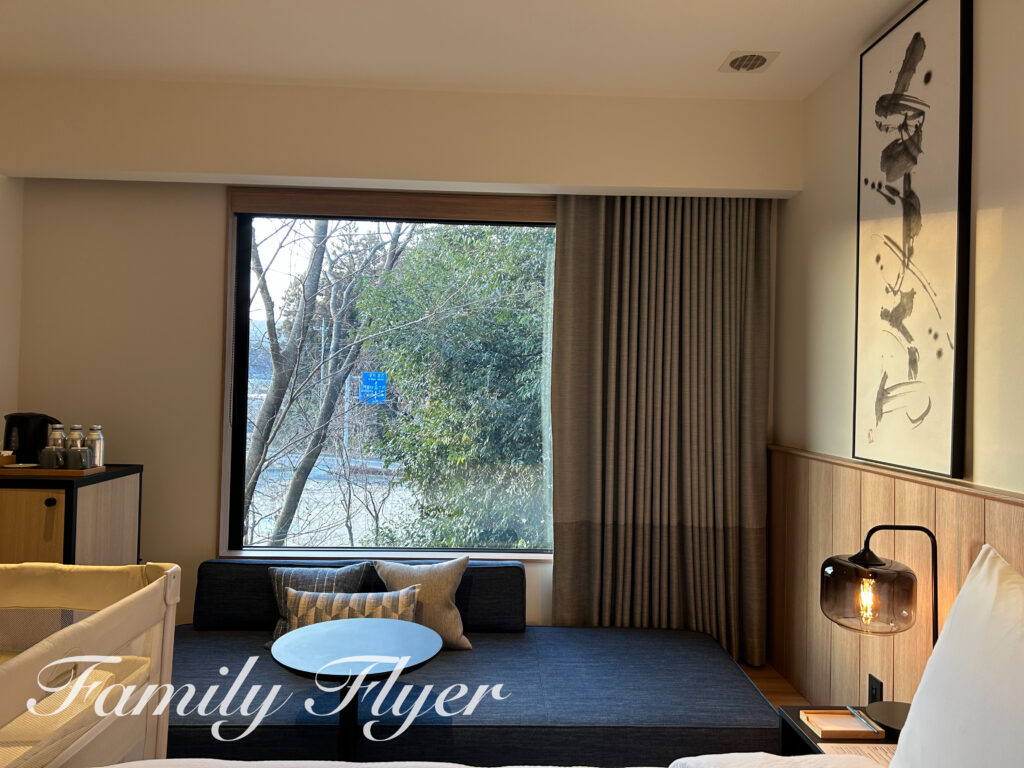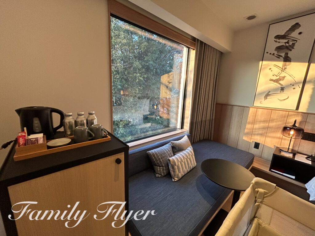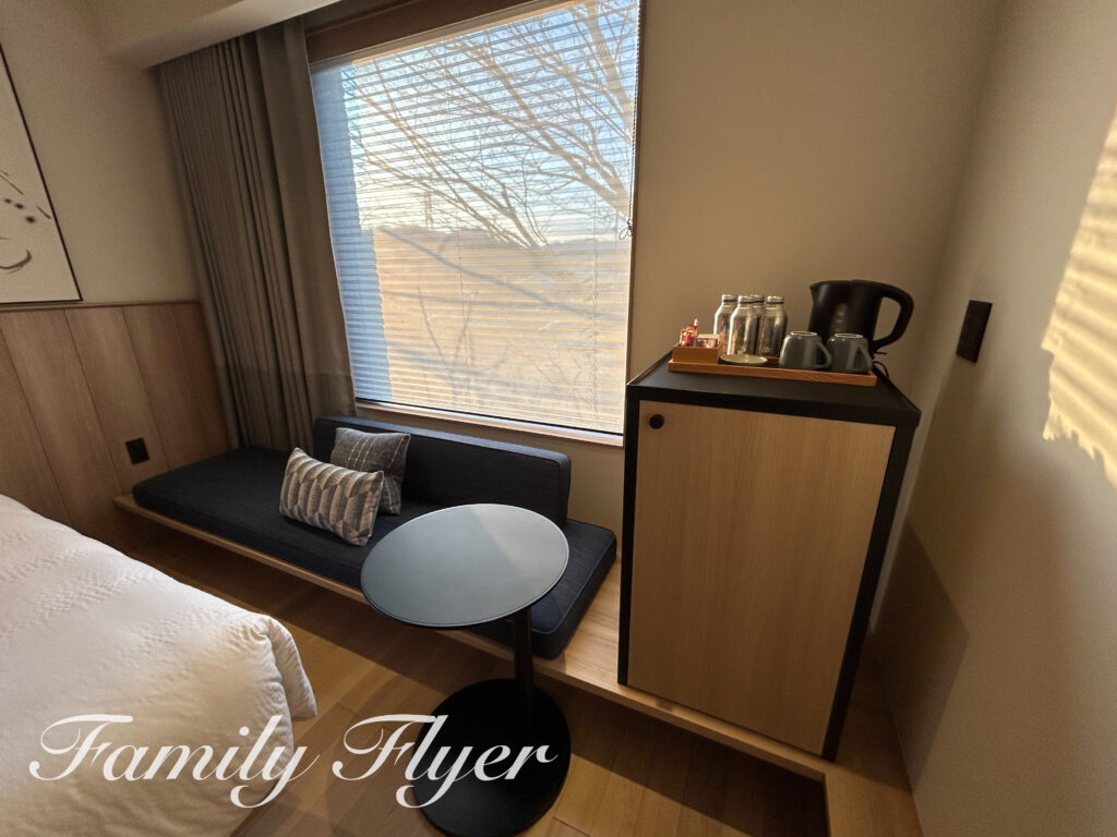 キングとツインの大きな違いは窓際のソファ。キングの客室は寝られるサイズ!また、ソファとベッドの間隔も、やはりもてぎより余裕がありました。