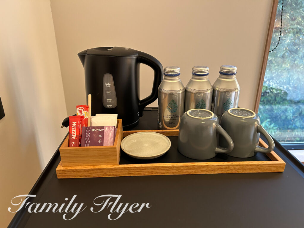 ミニバーにはコンプリメンツウォーター・インスタントコーヒー・紅茶あり。