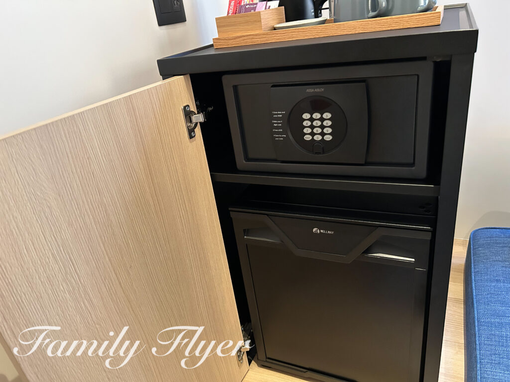 セーフティボックスはミニバー下にあります。