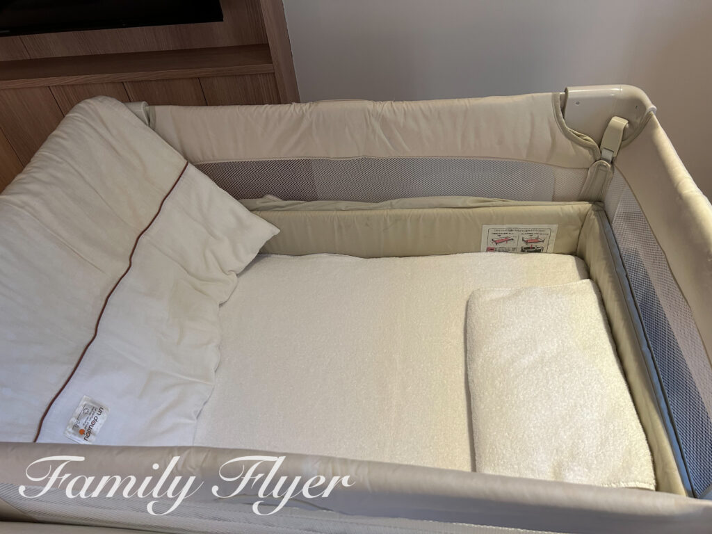 添い寝は1室につき12歳未満2名まで、赤ちゃんにはベビーベッド対応もしていただけます。
