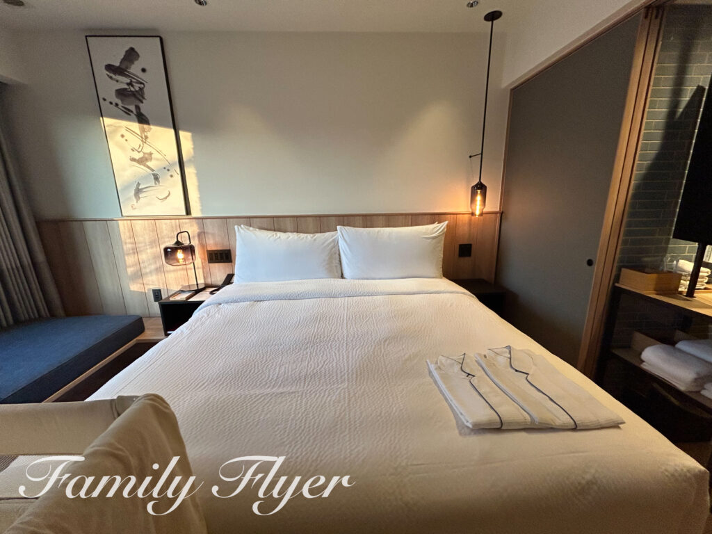 キングベッドの幅は180cm、小さなお子さん2名の添い寝でも余裕があります。マットレスの寝心地も良好です。