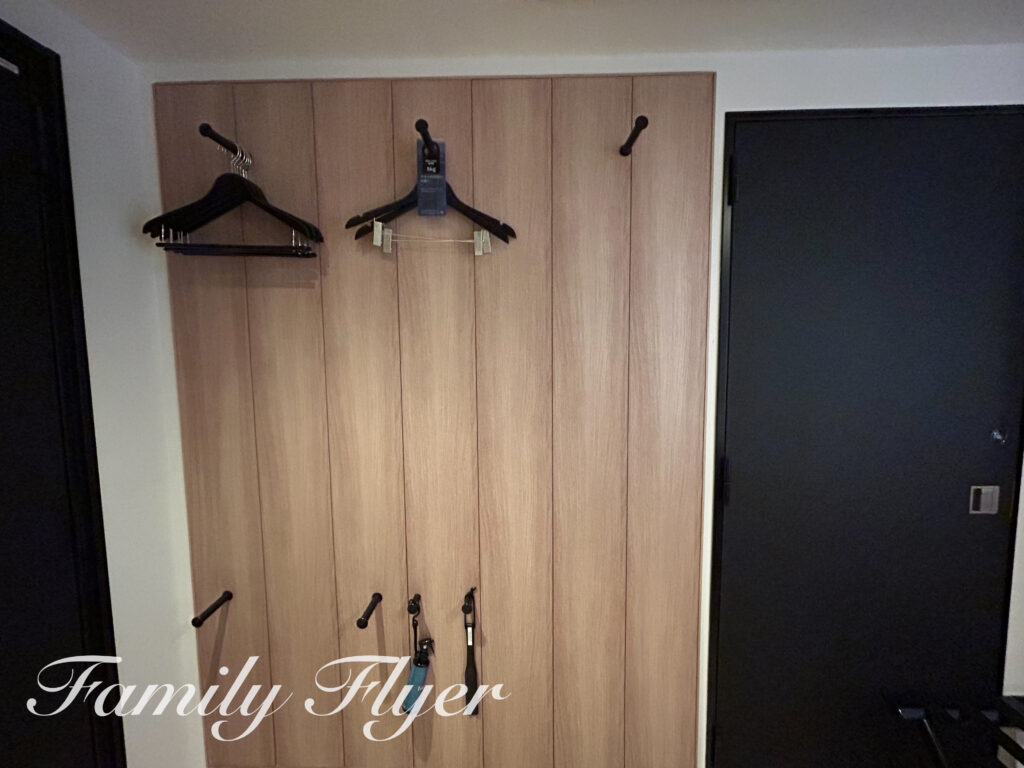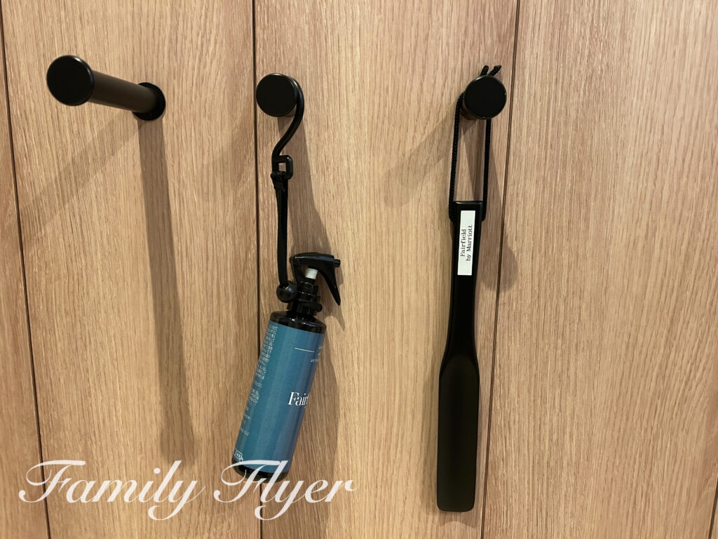 クローゼットはなく、壁にあるフックにハンガーが設置されています。衣類用消臭スプレーもあって便利。
