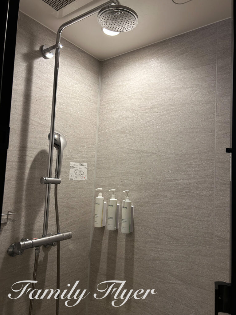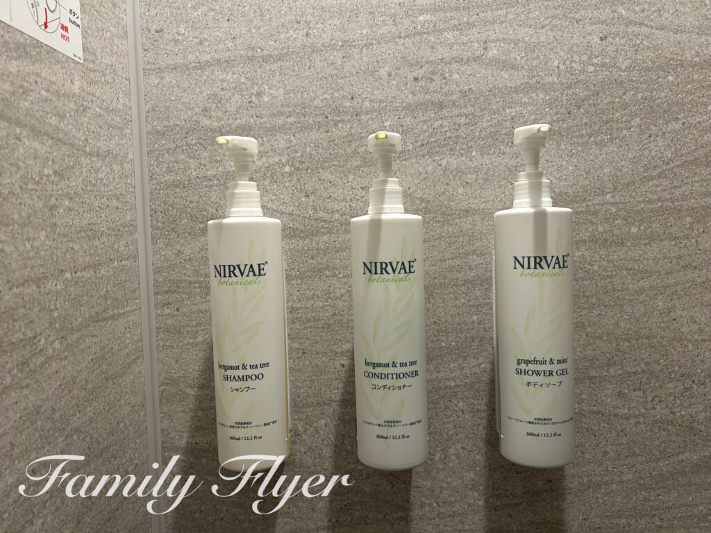 バスアメニティはコートヤードやフェアフィールドでお馴染み、ナチュラルな香りのNIRVAE。シンプルで万人受けのしっとりした使用感ですが、お肌のデリケートな方や小さなお子さんは持参が無難です。シンクにはハンドソープも設置されています。