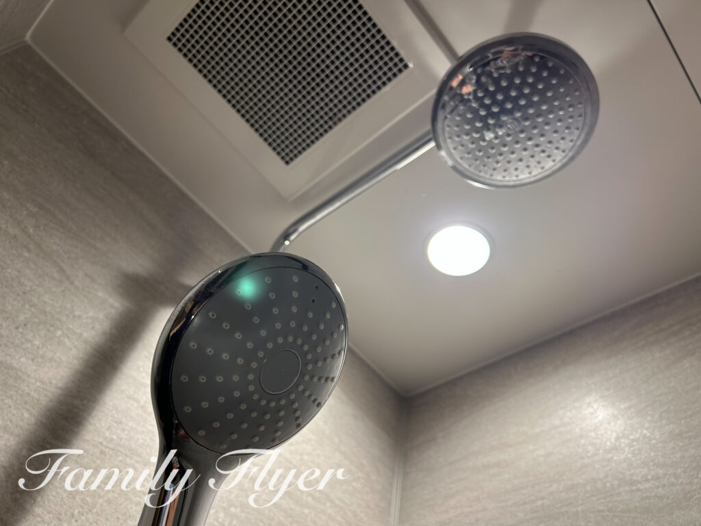バスタブはなくシャワーのみですが、レインシャワーもあるのは快適。ハンドシャワーは大きくて重めですが、ホルダーが可動式なので小学生でも使い勝手は良好です。