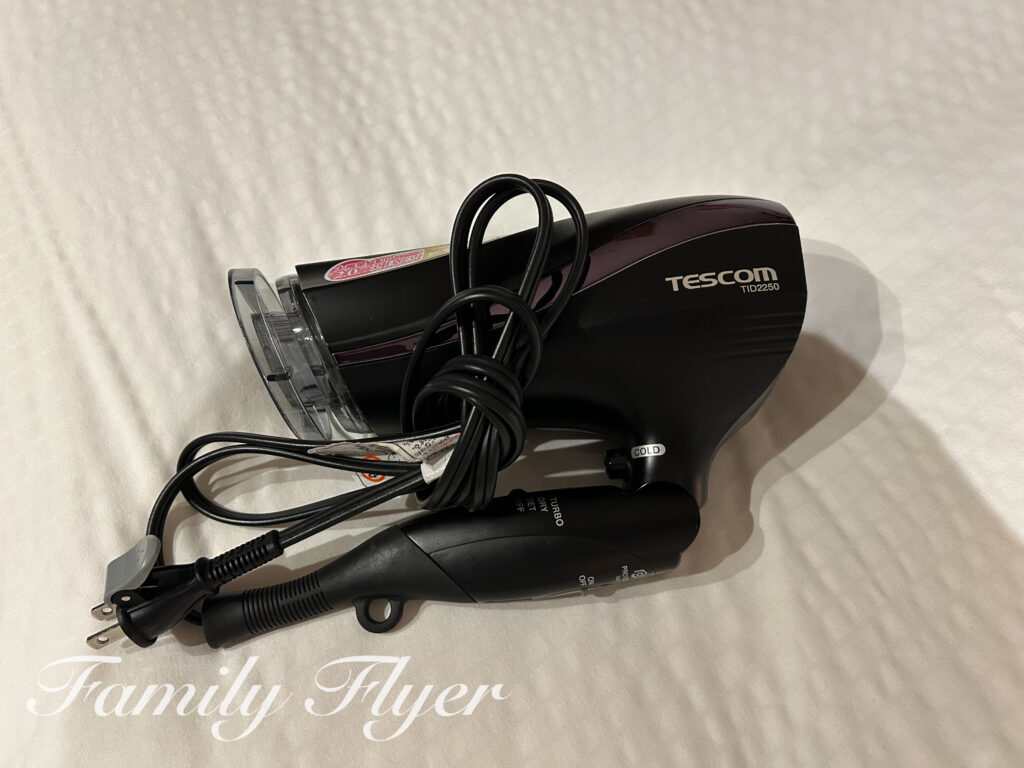 ヘアドライヤーはTescom。ランドリーバッグはビニール製で持ち手なしのものが2枚。