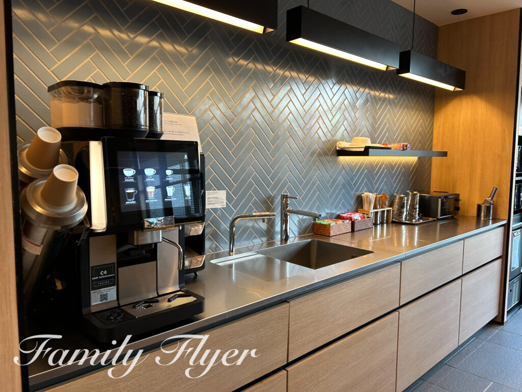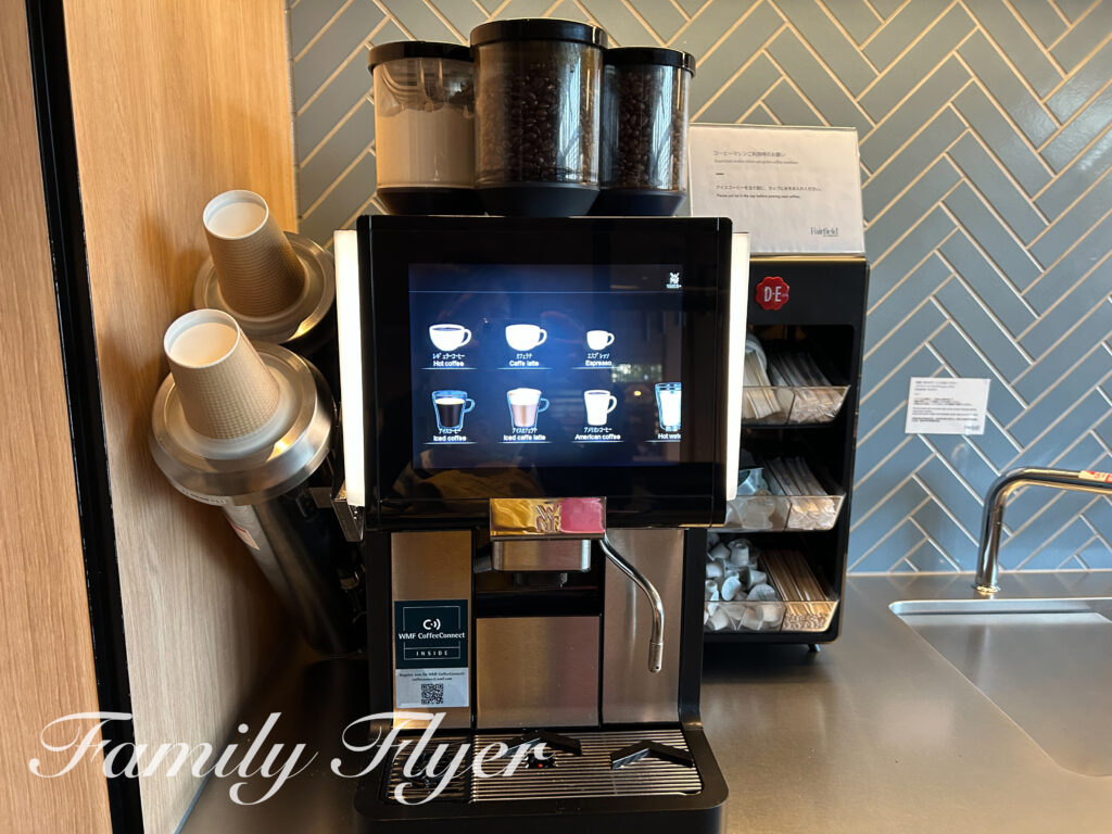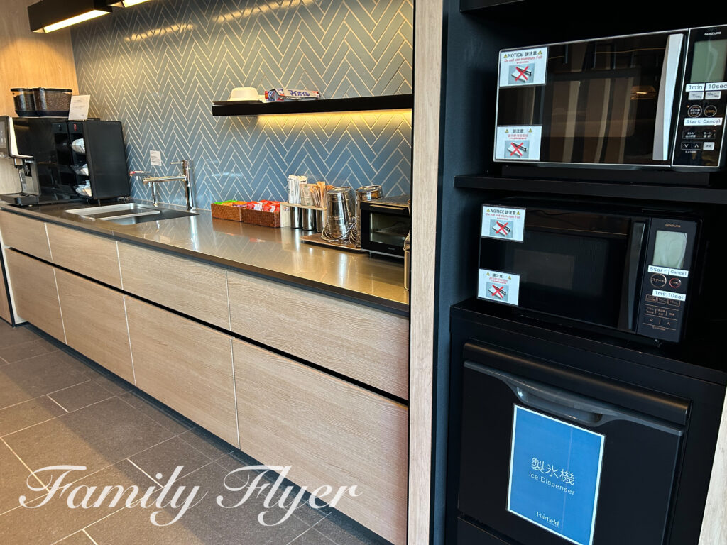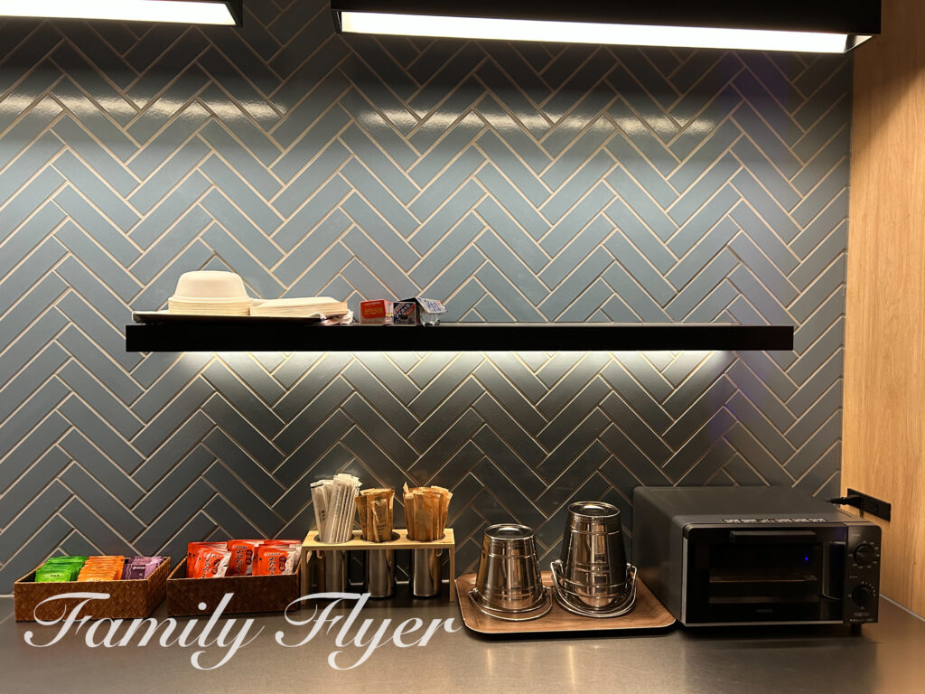 コーヒーマシンやお茶のほか、インスタントのお味噌汁も常設。ラウンジ内でいただくのはもちろん、客室まで持って行く事も可能です。
