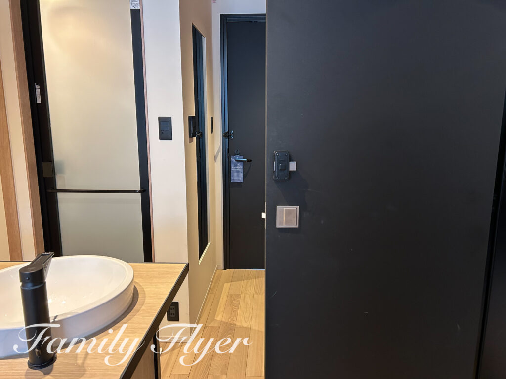 トイレにロックがなく、シャワーブースのドアもスケルトンのため客室内に仕切り扉があります。