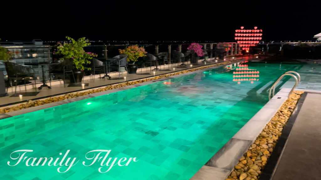 ルーフトップのプールは眺めが良く、夜はライトアップされて雰囲気も抜群なので常に賑わっていました。水深は1階と同じく0.4〜1.5m。