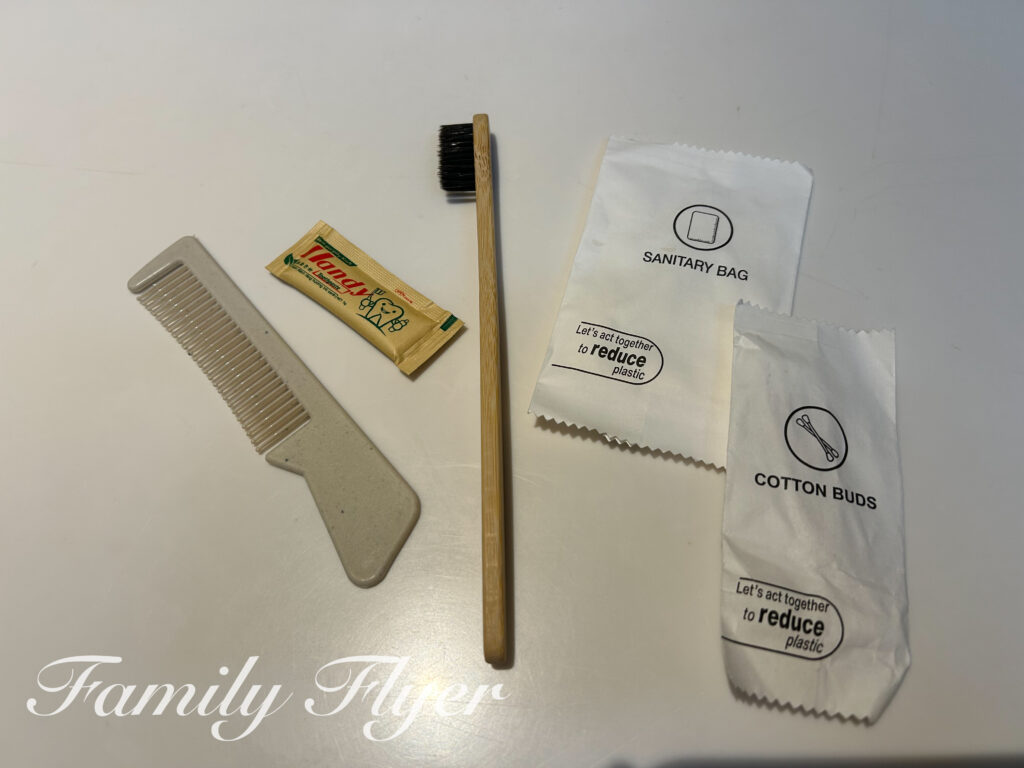 アメニティは竹製の歯ブラシ・コーム・綿棒と必要最低限。カミソリやマウスウォッシュ、シャワーキャップはなどはありません。