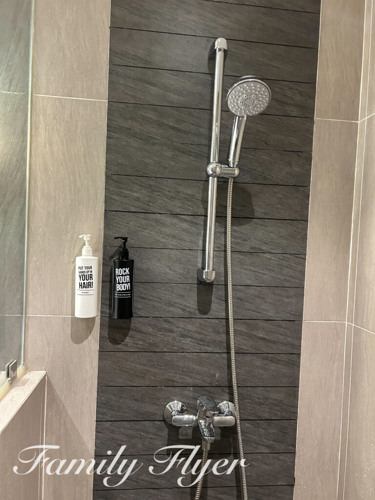 紅茶のようないい香りのオールインワンシャンプーのディスペンサーがシンクとシャワーブース内に。意外と1歳児やアトピーっ子が使用しても荒れませんでした。ドライヤーは壁にくっついたタイプ。