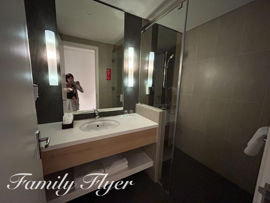 水回りはシンク、シャワーブース。ファミリールームとはいえ、スペースが限られているのでシンクの踏み台やバスタブはありません。