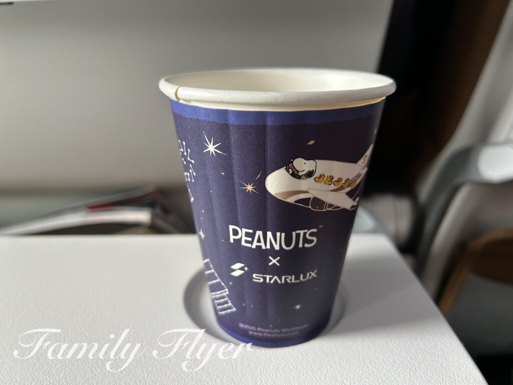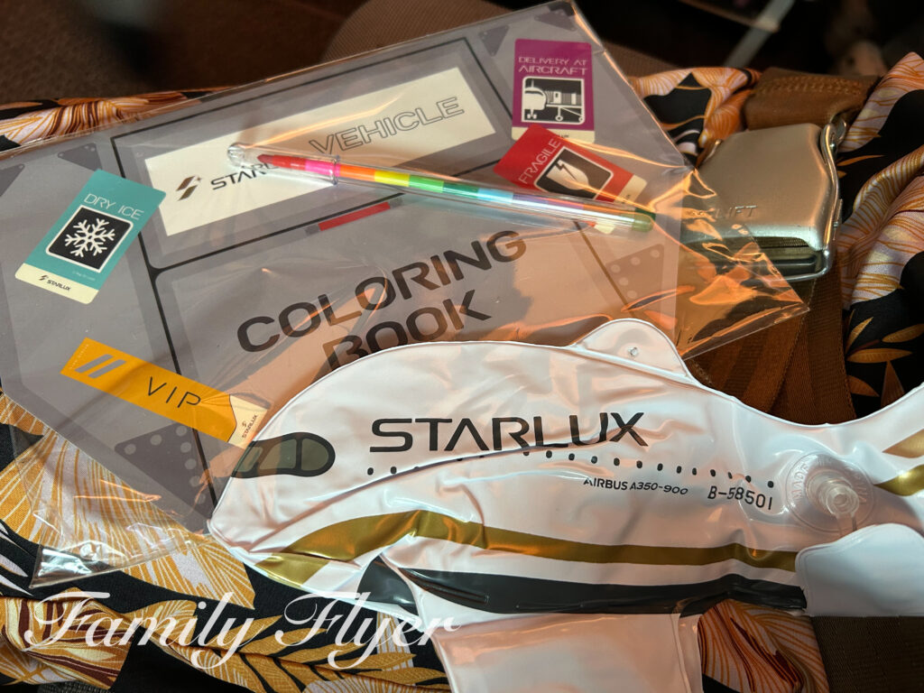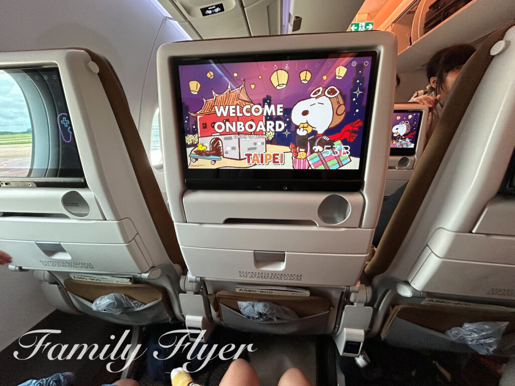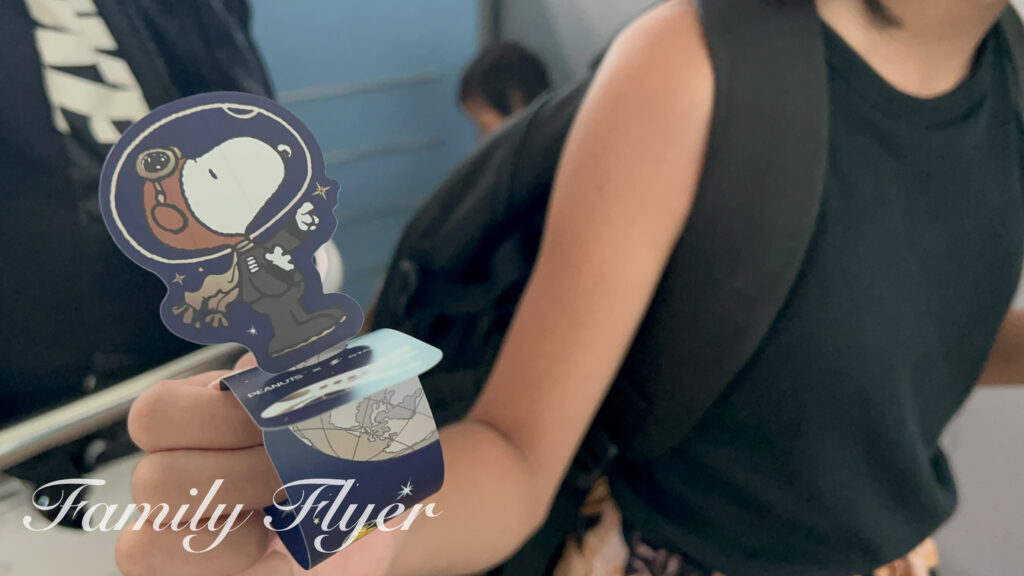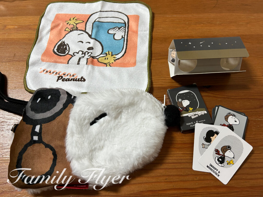 台湾発の便ではカードゲーム・タオルハンカチ・双眼鏡の入ったスヌーピーのポーチ、その他の便では塗り絵やバルーンをいただきました。