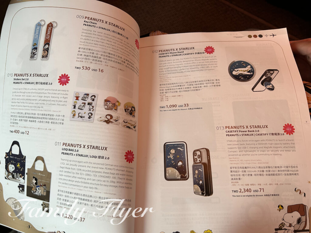 機内誌はなく、ちょっとやつれた免税カタログとエチケット袋が設置。オリジナルテディやスヌーピーグッズを取り扱っていました。