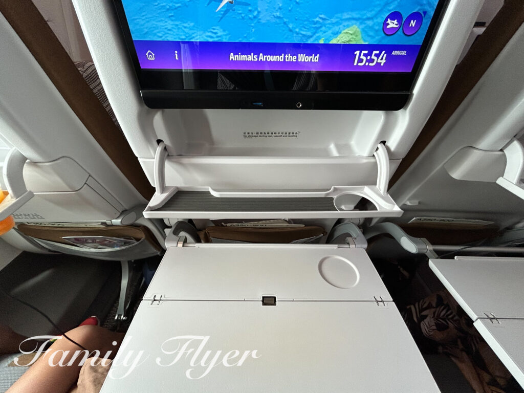 見やすいモニター、USB含む充電ポート完備。食事用のテーブルに加え、ドリンクホルダーにはタブレットなどを置けるスペースも。