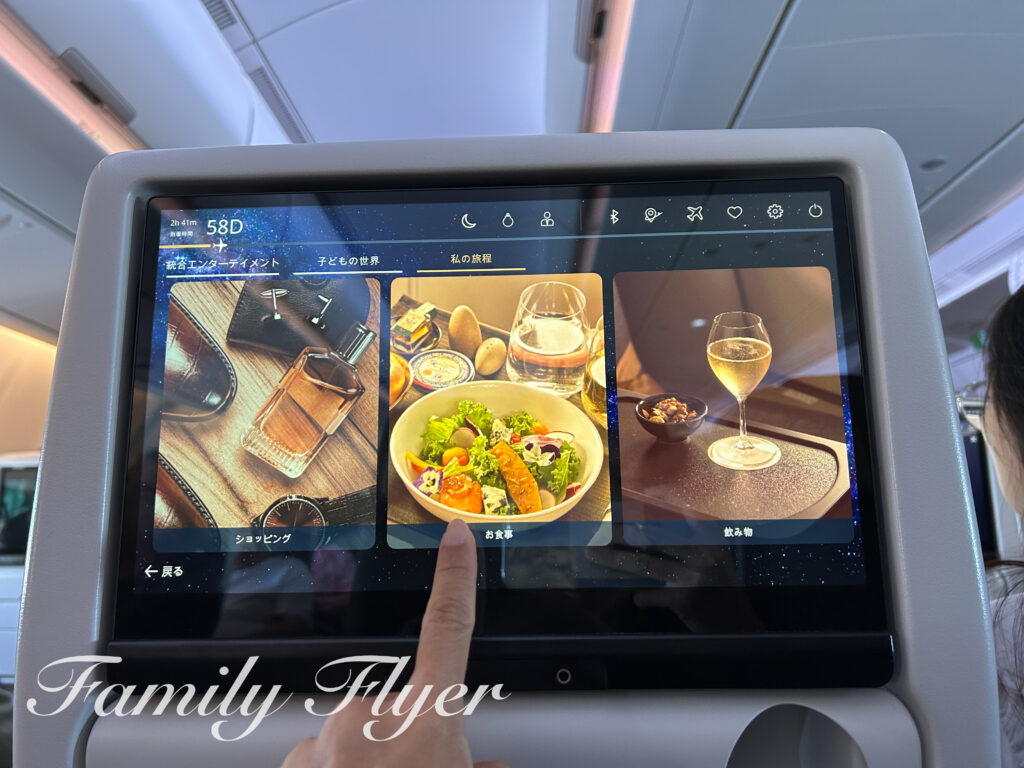 機内食やドリンクはモニターのメニューで事前に確認できます。