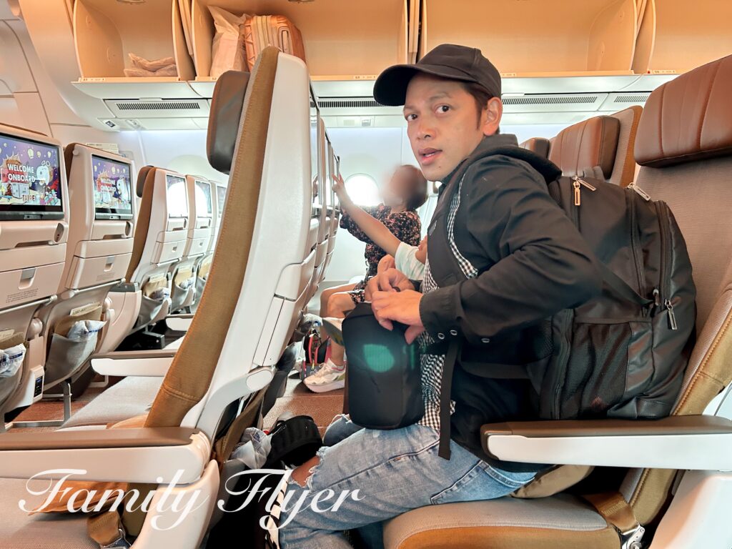 機材はA350-900、座席列は3・3・3でシートピッチは約81cm。大きなリュックを背負ったままでもこの余裕があるほどの広さです。